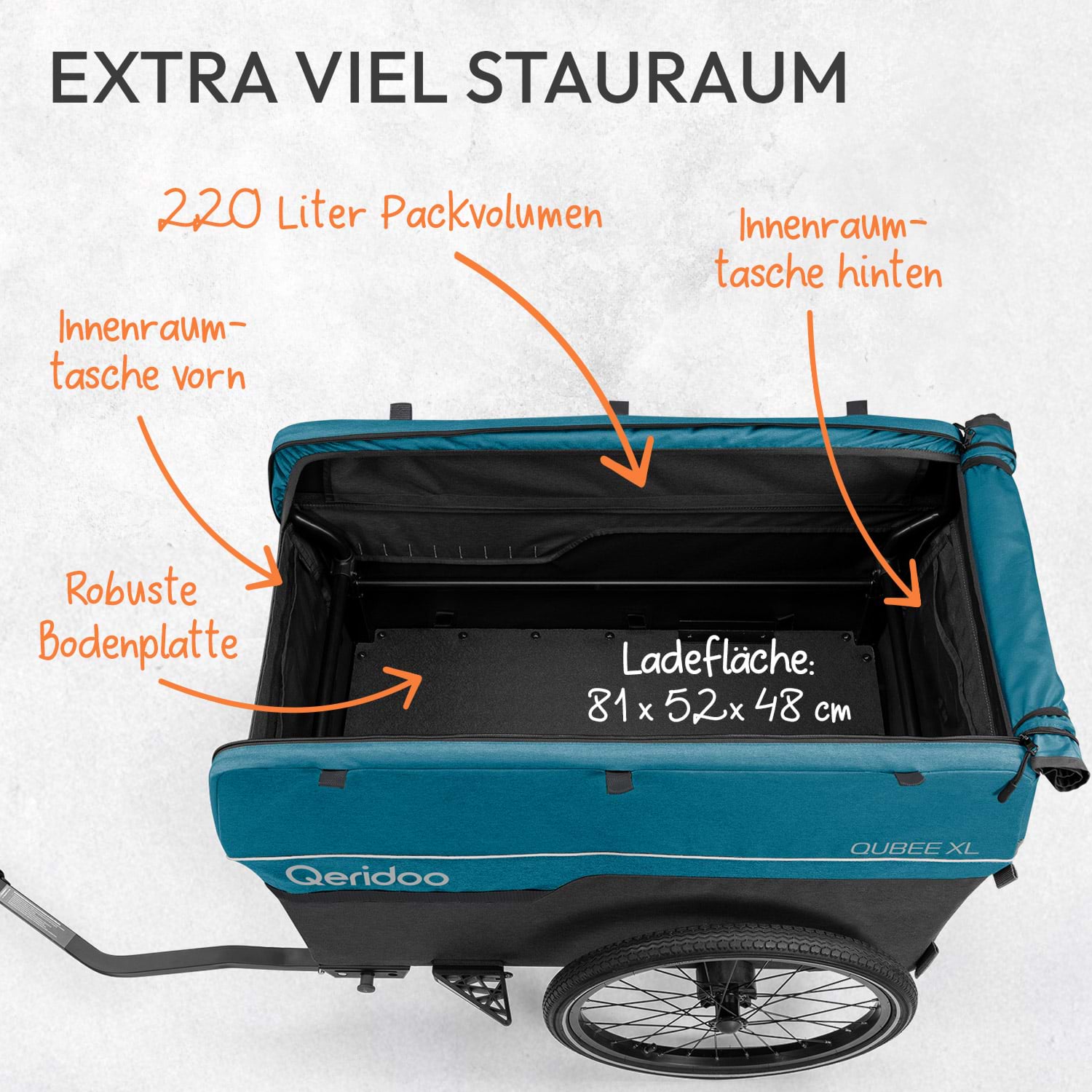 - Zulässiges Gesamtgewicht: 50 kg (Anhänger inkl. Kind und Gepäck)