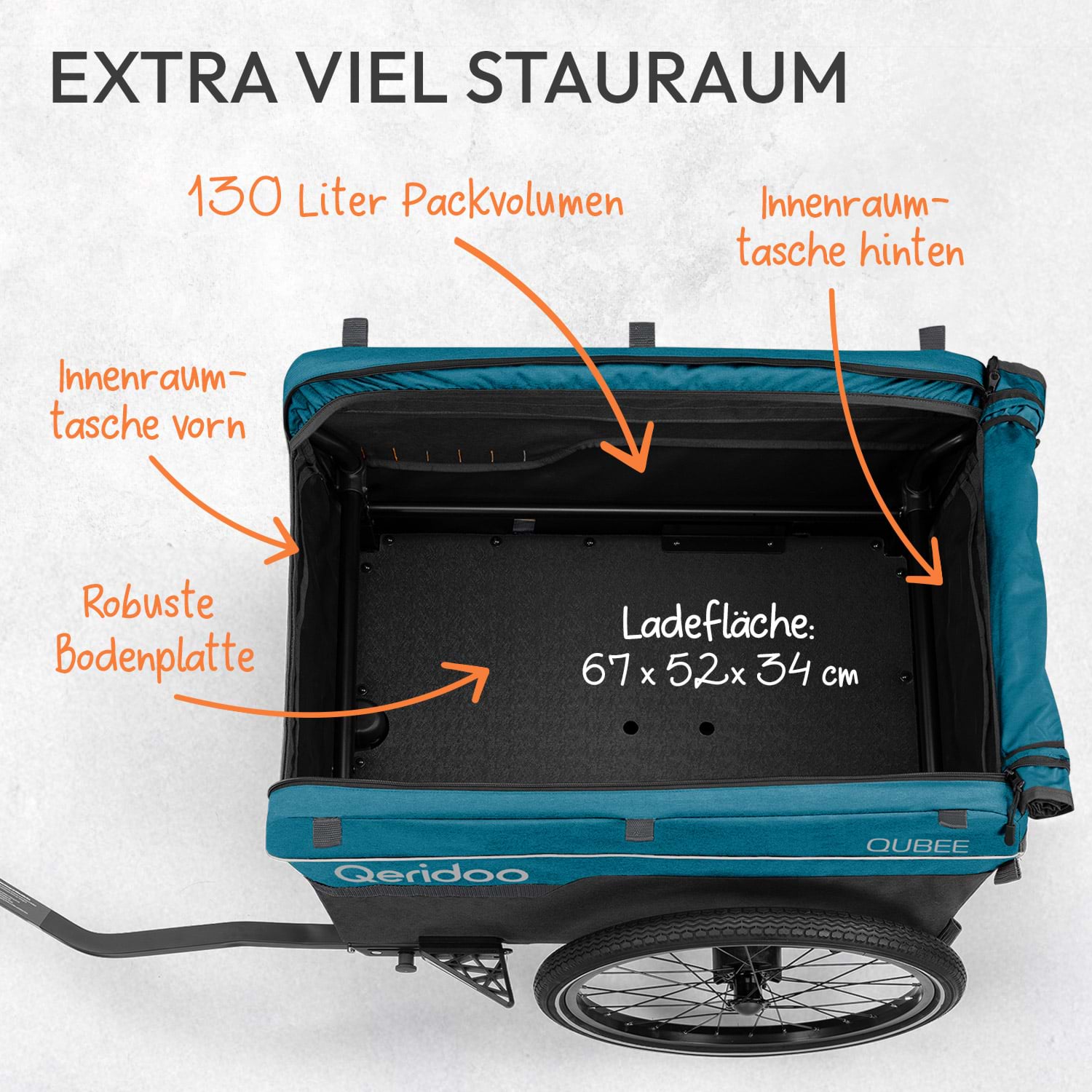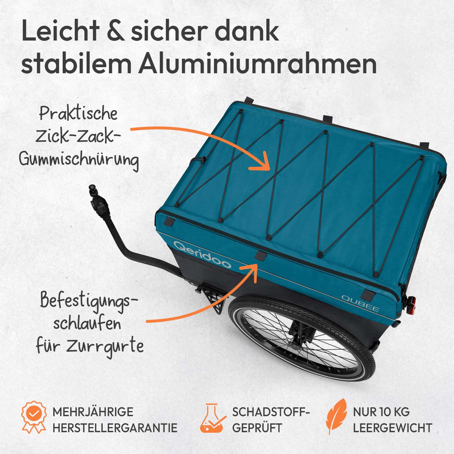 Der Qeridoo Qubee erfüllt sämtliche sicherheitstechnischen Anforderungen der Europäischen Sicherheitsnormen EN 15918:2011+A2:2017 (Fahrradanhänger) und EN 1888-2:2018+A1:2022 (Kinderwagen).