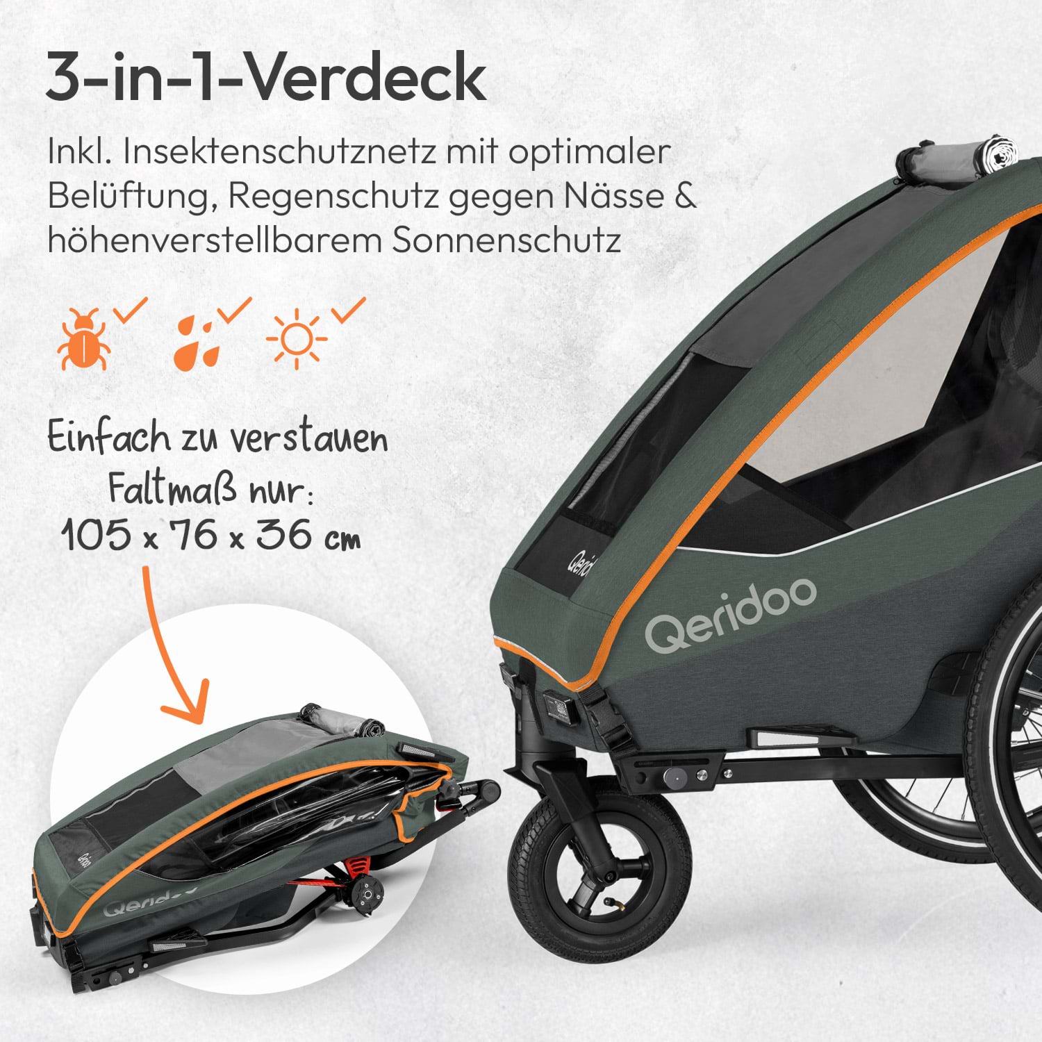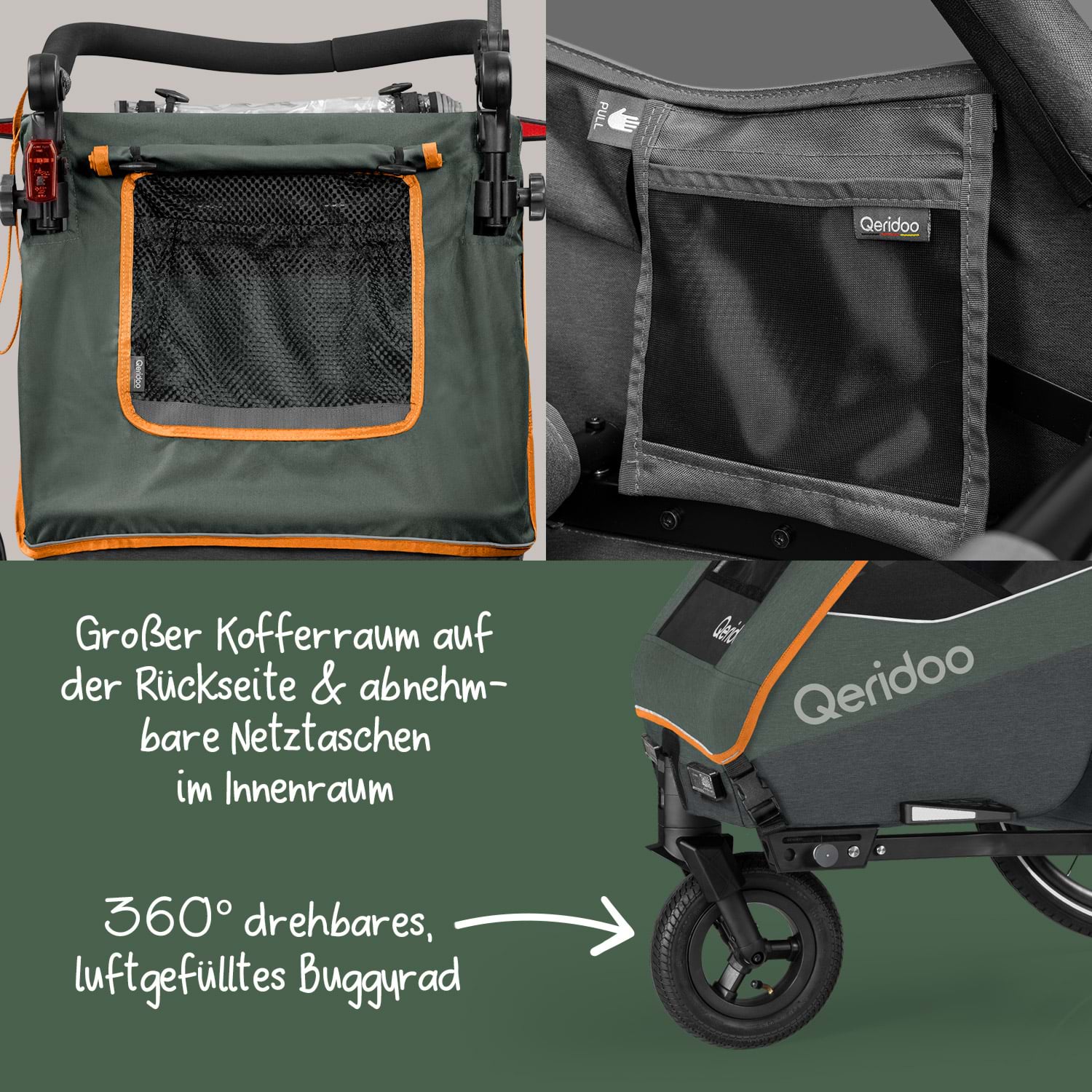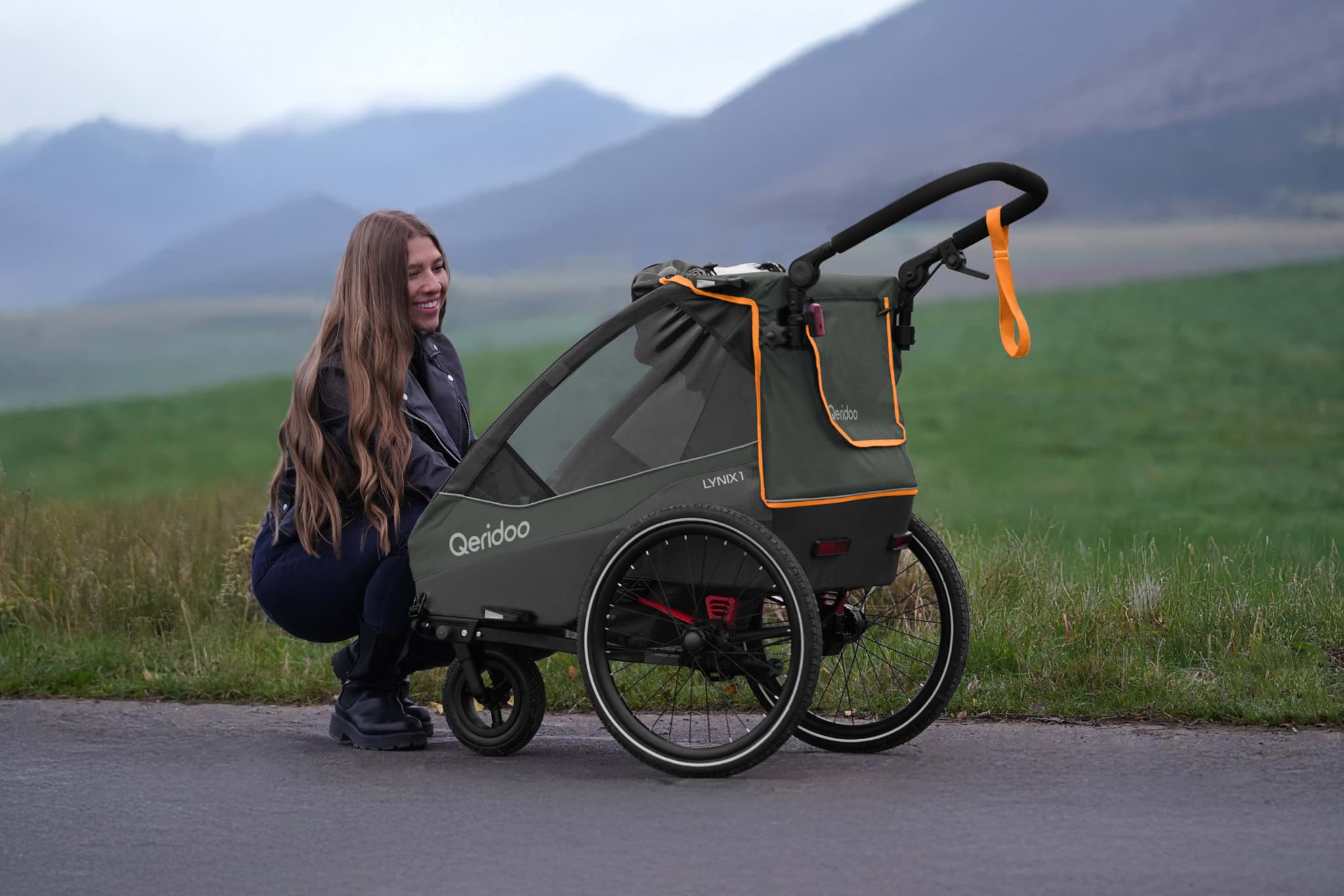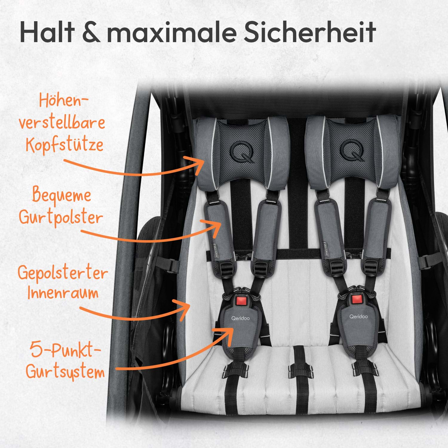Die Sicherheit der Kinder hat bei Qeridoo höchste Priorität. Alle Kinderfahrradanhänger verfügen über einen verstärkten Aluminiumrahmen für umfassenden Rundumschutz sowie über patentierte Kopfprotektoren, die im Falle eines Umkippens einen wichtigen seitlichen Sicherheitsabstand schaffen. Zusätzlich ist ausreichend Kopffreiheit gewährleistet, sodass bei einem Umkippen kein Kontakt mit Boden oder Rahmen entsteht; der höhenverstellbare Handgriff dient im Fahrradmodus zudem als Überrollbügel.