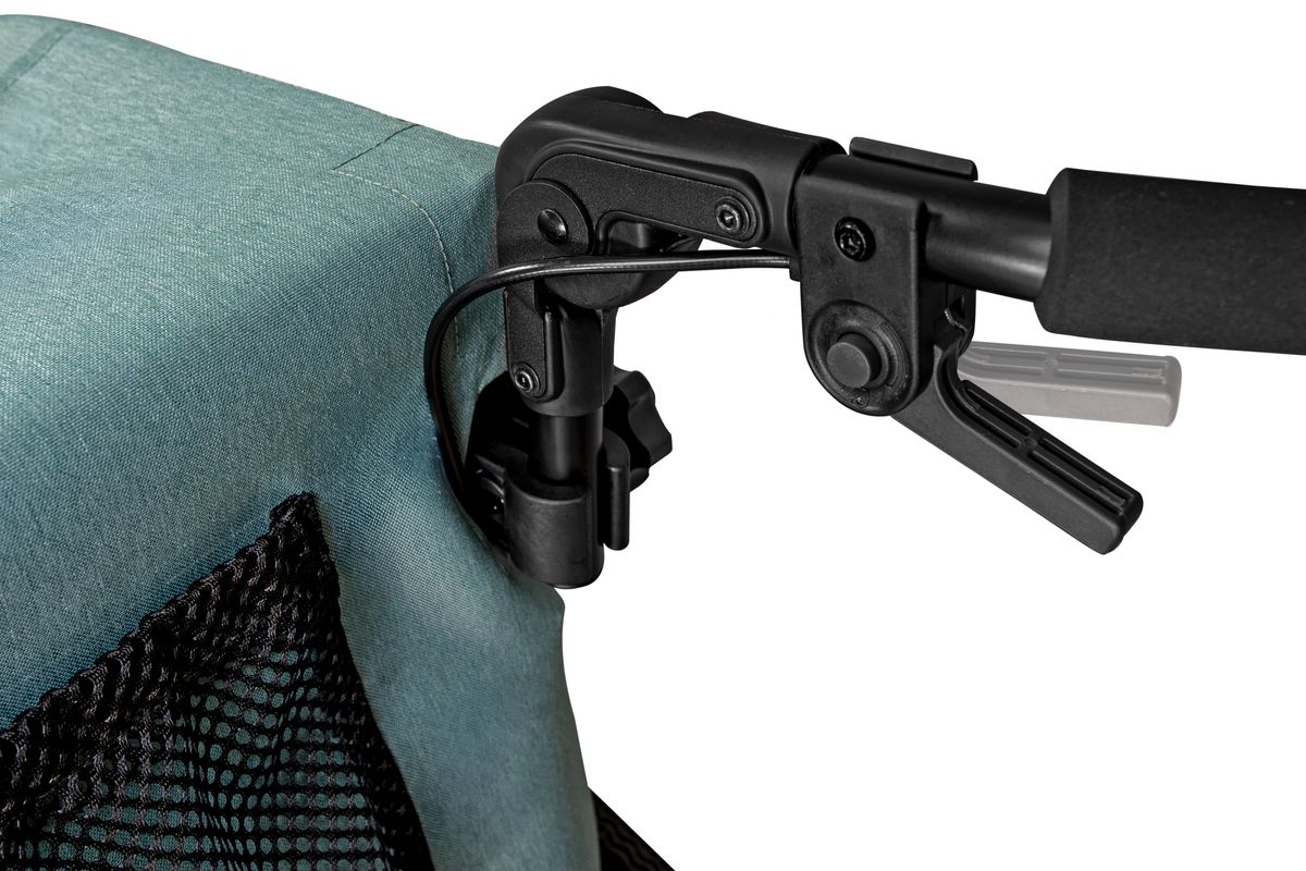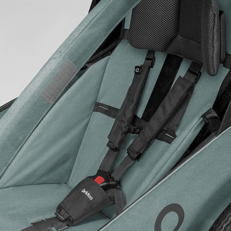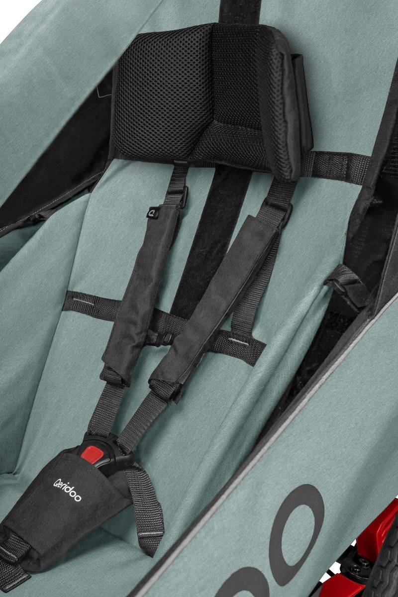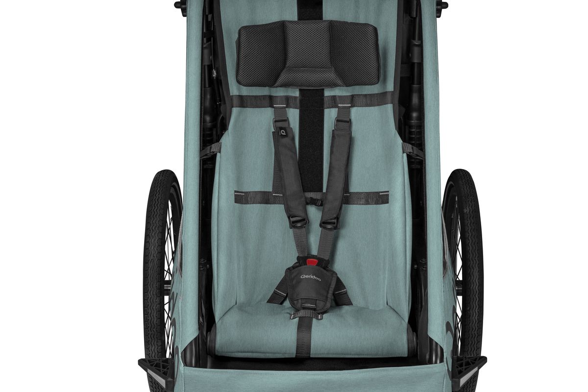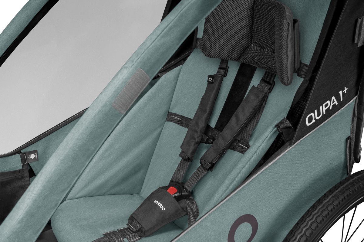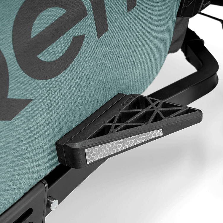 Im Innenraum sorgt ein individuell anpassbares 5-Punkt-Gurtsystem für sicheren und komfortablen Halt. Für maximale Sichtbarkeit im Straßenverkehr sind Rücklicht, Front- und Heckreflektoren, Reflektorstreifen an den Laufrädern und im Stoffdesign sowie ein Sicherheitswimpel enthalten, der im Fahrradmodus verpflichtend montiert sein muss.