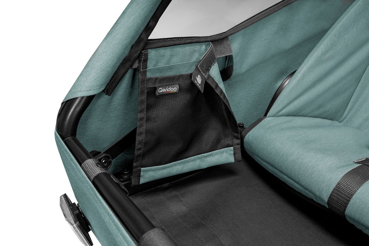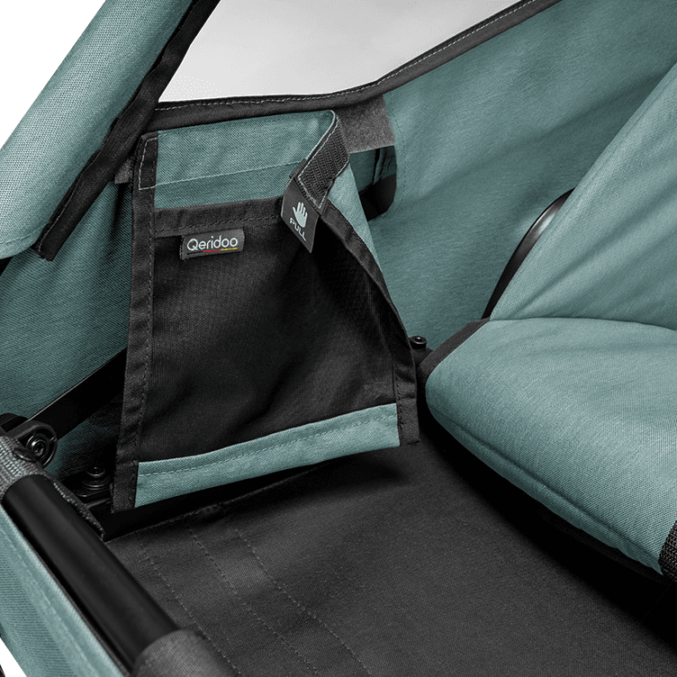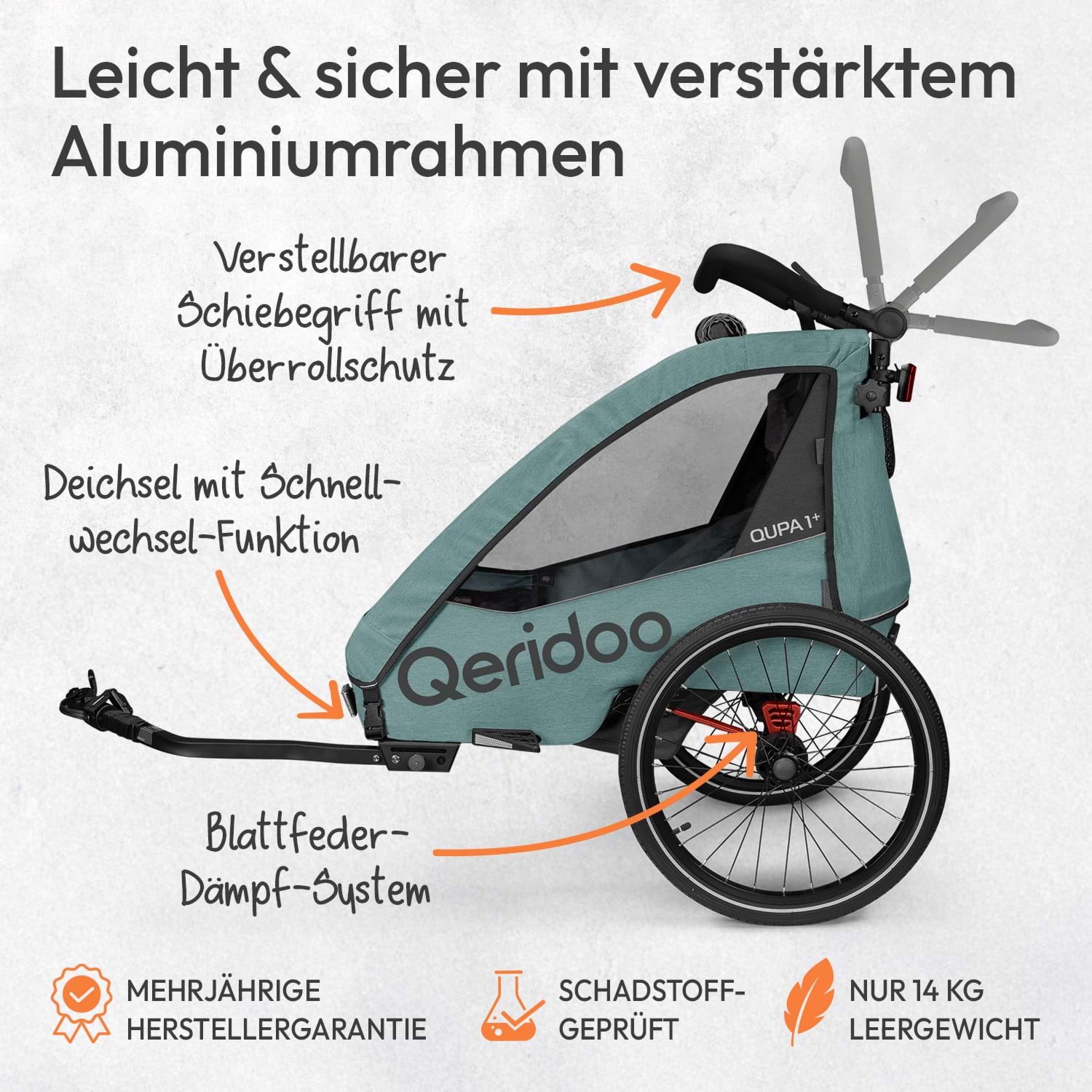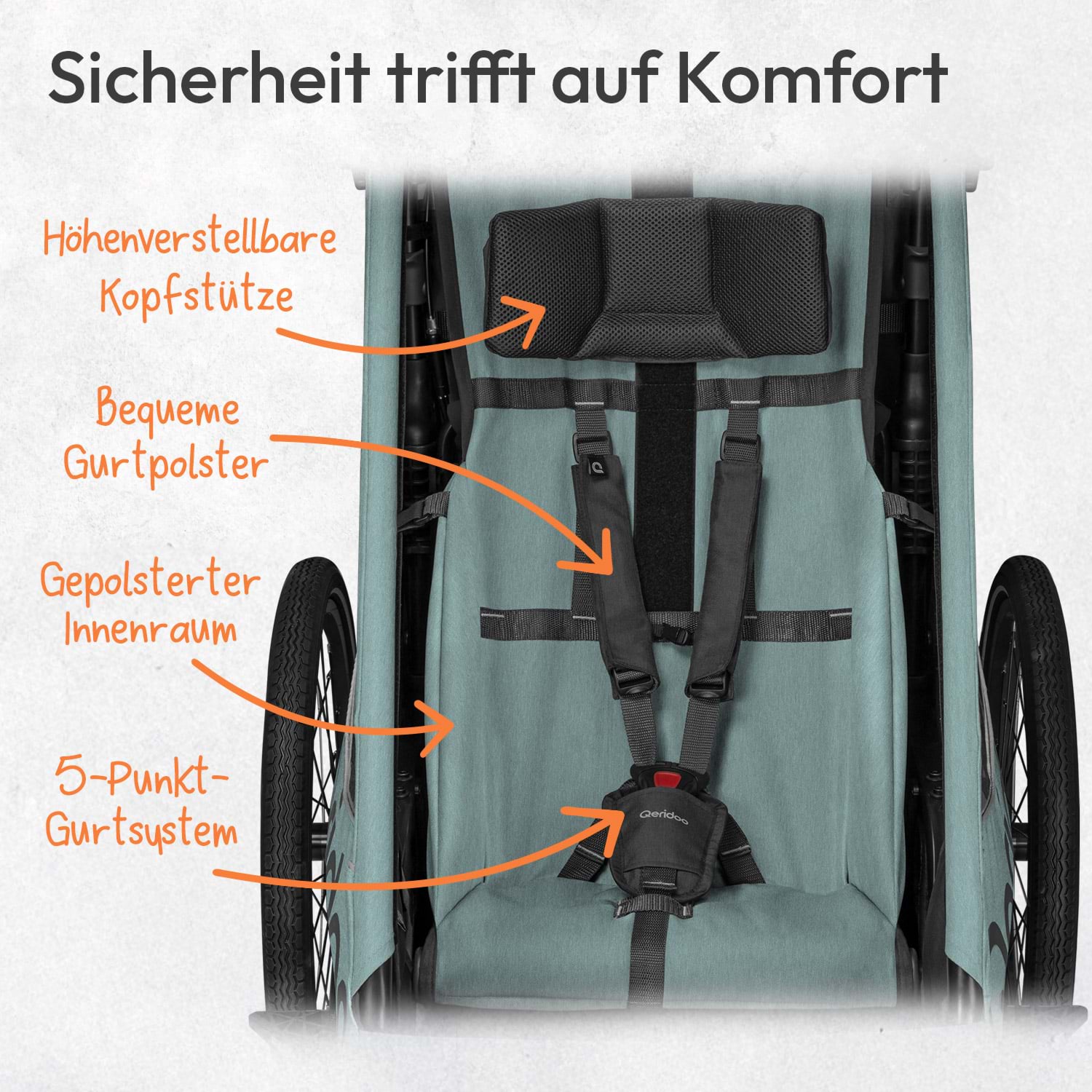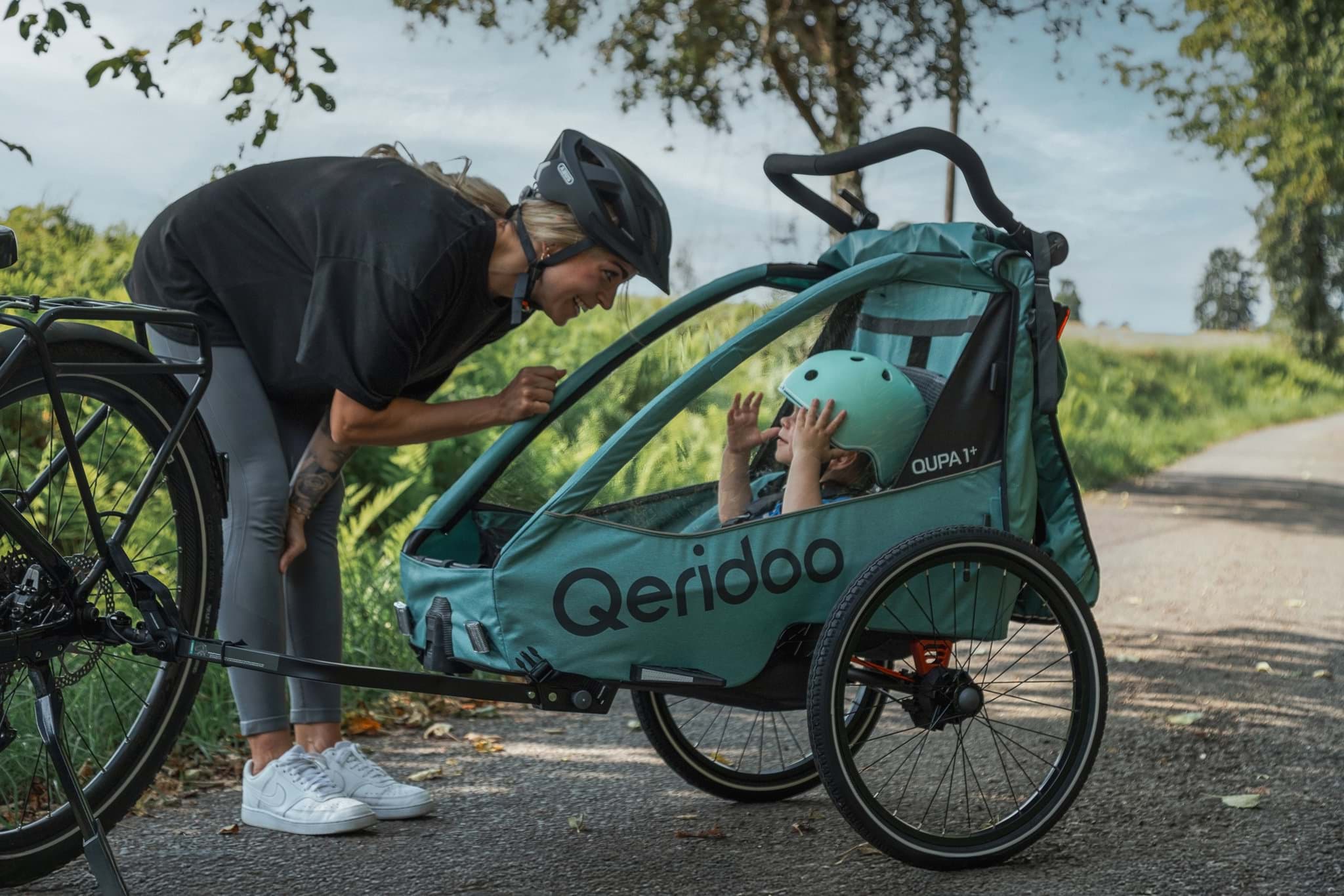 Die Sicherheit der Kinder hat bei Qeridoo höchste Priorität. Alle Kinderfahrradanhänger verfügen über einen verstärkten Aluminiumrahmen für umfassenden Rundumschutz sowie über patentierte Kopfprotektoren, die im Falle eines Umkippens einen wichtigen seitlichen Sicherheitsabstand schaffen. Zusätzlich ist ausreichend Kopffreiheit gewährleistet, sodass bei einem Umkippen kein Kontakt mit Boden oder Rahmen entsteht; der höhenverstellbare Handgriff dient im Fahrradmodus zudem als Überrollbügel.
